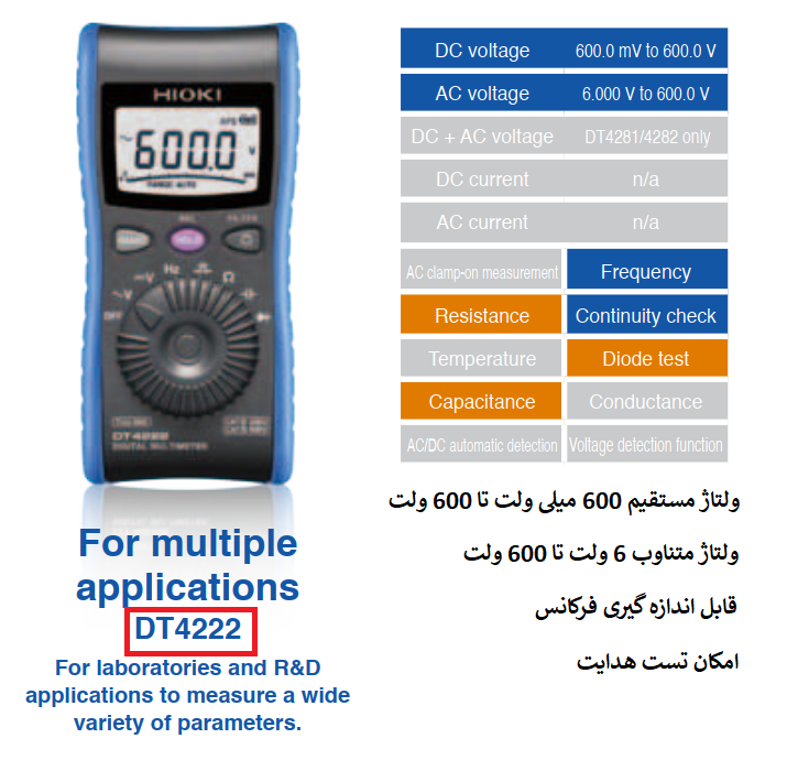 در تصاویر زیر می توانید انواع مدل های مولتی متر هیوکی مدل DT42xxx را مشاهده و مشخصات و کاربرد هر کدام را مشاهده نمایید لازم به توضیح است رنگ ابی به مفهوم امکان اندازه گیری و رنگ نارنجی به مفهموم بعضی از مدل های زیر مجموعه این توانایی اندازه گیری را دارند